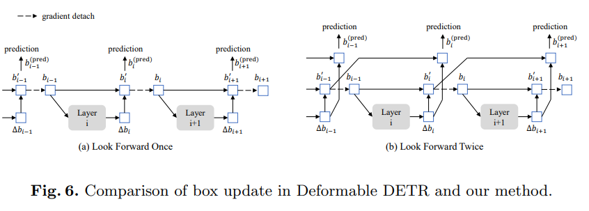 - 쿼리 선택 및 두 디코더 계층 사이의 gradient 분리 설계를 통해 반복적인 경계 상자 개선을 가능하게 함
