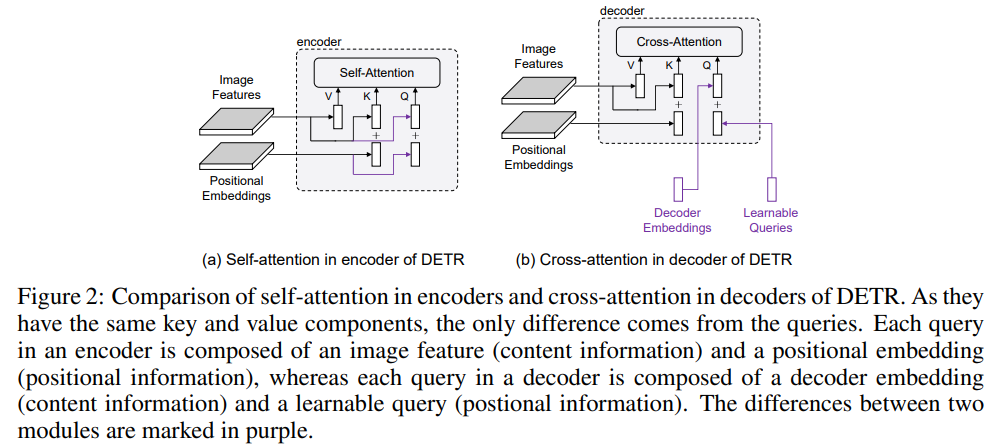 이전의 연구는 기존의 DETR에서 Learnable Queries와 Decoder Embedding이 query로 들어가는데, learnable Queries가 느린 학습의 주 원인이라고 분석하고 있습니다. 해당 query를 빼보고 학습해보기도 하고 잘 학습된 고정된(fixed) query를 사용해보기도 하는 등 여러가지 실험을 통해 learnable queries 때문에 빨리 수렴이 되지 않는 다는 것을 분석했는데요.