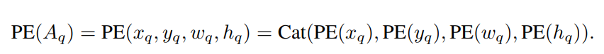 𝐴𝑞=(𝑥𝑞,𝑦𝑞,𝑤𝑞,ℎ𝑞)는 sigmoid가 취해진 [0, 1] 범위의 앵커 박스들의 좌표들이고, 이 좌표들을 sinusoidal embedding시키는 것이 PE이며, MLP는 Linear Layer(모든 레이어에서 파라미터를 공유)입니다.