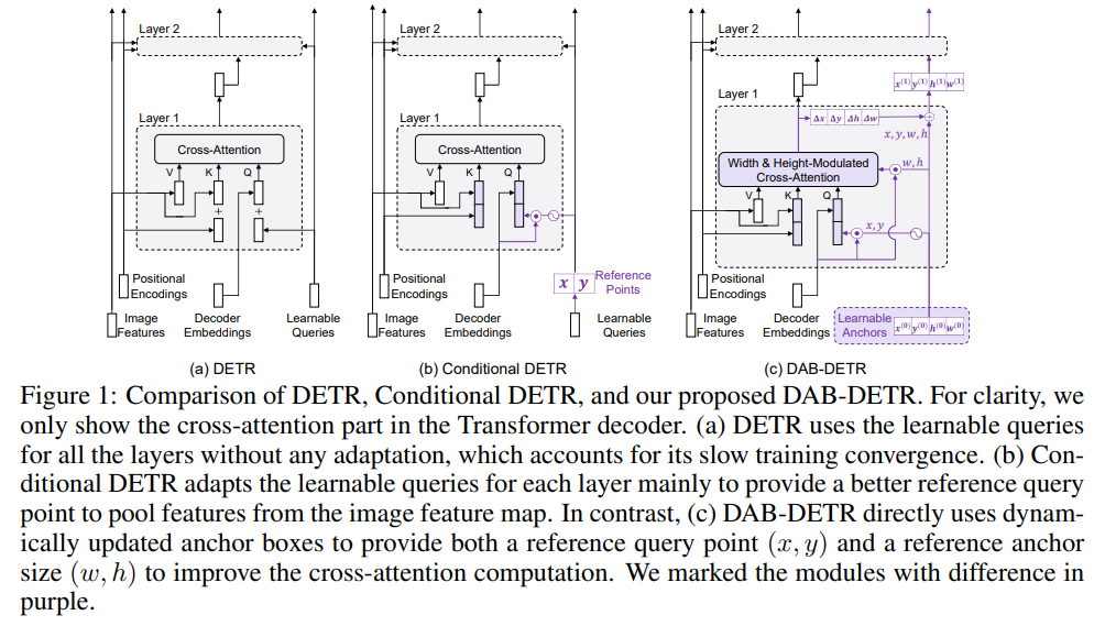 Encoder 부분의 cross-attention 모듈에서 4D box coordinate (x, y, w, h)를 query로 사용하고 layer마다 update하는 것을 제안합니다. Spatial point(x,y)와 함께 scale 정보(w,h)가 들어 있어 scale 고려가 가능해집니다. (젤 위의 그림에서의 문제를 해결)