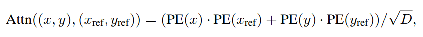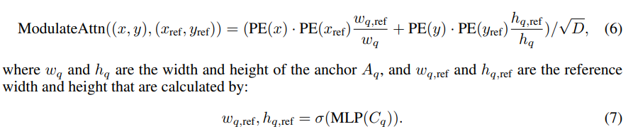 기존의 Conditional DETR의 단점은 위에서 언급했던 것처럼 스케일 크기를 고려하지 못한 feature map이 나온다는 것입니다. Conditional DETR의 Positional 쿼리에 대한 Cross-Attention 연산은 아래와 같습니다.