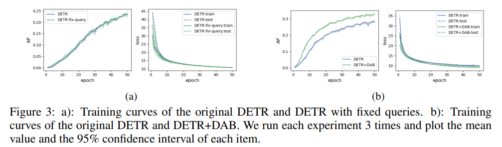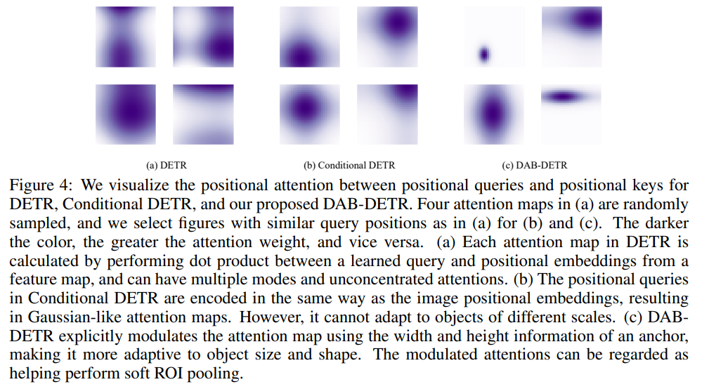 저자들은 multiple mode property가 학습이 느려지는 주 요인이라고 생각하여 각 query가 특정 지역에 집중하도록 하는 동적 앵커 박스, 즉 dynamic anchor box들을 사용하여 성능을 평가하였고 그거는 위의 figure.3 오른쪽 그림에서 보이는 것처럼 더 좋은 성능을 보여주었다고 주장합니다.