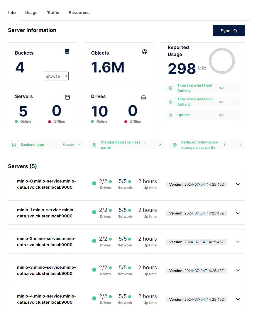 MinIO Console의 Info를 제외한 나머지 부분(Usage, Traffic, Resources)를 확인하려면 Prometheus를 설정해야 한다.