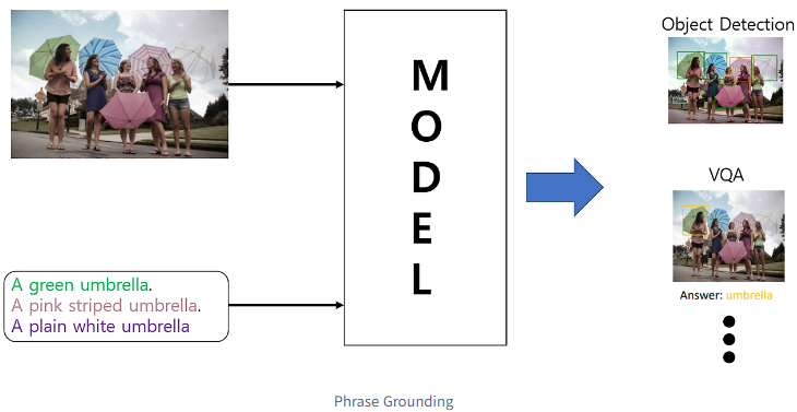 간단하게 phrase grounding이 무엇인 지 설명하자면, image와 그에 해당하는 caption (이미지를 설명하는 text)가 두개 다 주어진다면(즉, phrase grounding data를 의미), Pharse Grounding는 caption에 있는 명사구에 해당하는 각 entity를 이미지 영역에 매칭(접지)하는 Task를 의미합니다.