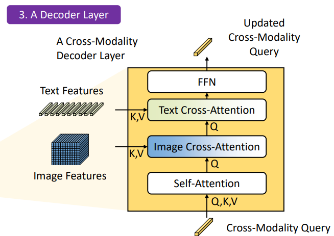 위의 그림과 같이 저자들은 이미지와 텍스트 modality 기능을 결합하기 위해 cross modality 디코더를 개발하였습니다. 각 디코더 계층에는 DINO 디코더 계층에다가 텍스트 cross attention 계층을 추가하였는데, 이렇게 한 이유는 더 나은 modality 정렬을 위해 쿼리에 텍스트 정보를 주입해야 하기 때문이라고 설명합니다.