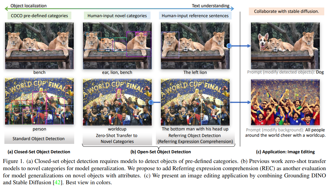 기존에는 Closed-Set Object Detection 부분을 보시면 데이터셋에 labeling이 되어있는 부분만 분류 및 탐지를 할 수 있었습니다. 하지만 기술이 진화하면서 점점 labeling되어있지 않은, 즉 더 많은 분야와 범위를 감지를 할 수 있게 되었습니다. (위의 그림처럼 Bench만이 아닌, The left Lion처럼) 이러한 객체 감지 기술을 본 논문에서는 Open-Set Object Detection이라 설명합니다.