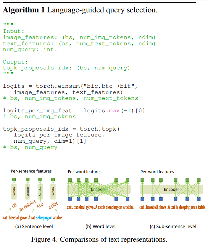 알고리즘의 Pseudo Code는 아래와 같습니다. 간단하게 설명하자면, 변수 image features 와 text features는 각각 image features와 text features이며, num_query는 디코더 쿼리 수(실제로는 900으로 설정했다고 함)이고 bs : batch-size, ndim : 그냥 차원, 마지막으로 이미지 토큰 및 텍스트 토큰은 말 그대로 토큰입니다.