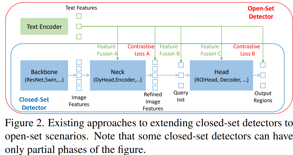 개념적으로는 위의 방법이 간단하지만 실제로 Fast-RCNN과 같은 모델은 block 단계에서 언어 정보와 상호 작용하기 어려습니다. 근데 DINO는 위의 모델과 다르게 일관된 구조를 가지고 있다고 설명합니다.