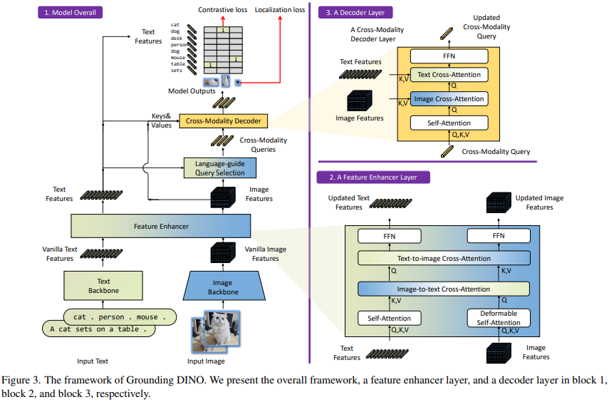 Grounding-DINO는 이미지와 텍스트를 입력으로 하여 multiple pairs of object boxes and noun phrases(명사구)를 출력합니다. 위의 그림에서 예를 들면 입력 이미지에서 고양이와 테이블을 위치시키고 입력 텍스트에서 단어 고양이와 테이블을 해당 레이블로 추출하는 형태가 되겠습니다.