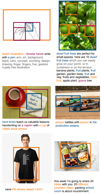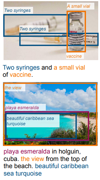 학습된 teacher 모델을 web collected 이미지-텍스트 데이터에 대한 box를 예측하여 pseudo label data을 생성합니다. Student model은 Gold Data + Pseudo label data로 학습합니다. 그렇게 되면 아래 그림처럼 의미론적으로 풍부한 개체(Semantically rich entities)에 대한 정확한 box를 생성할 수 있게 됩니다!