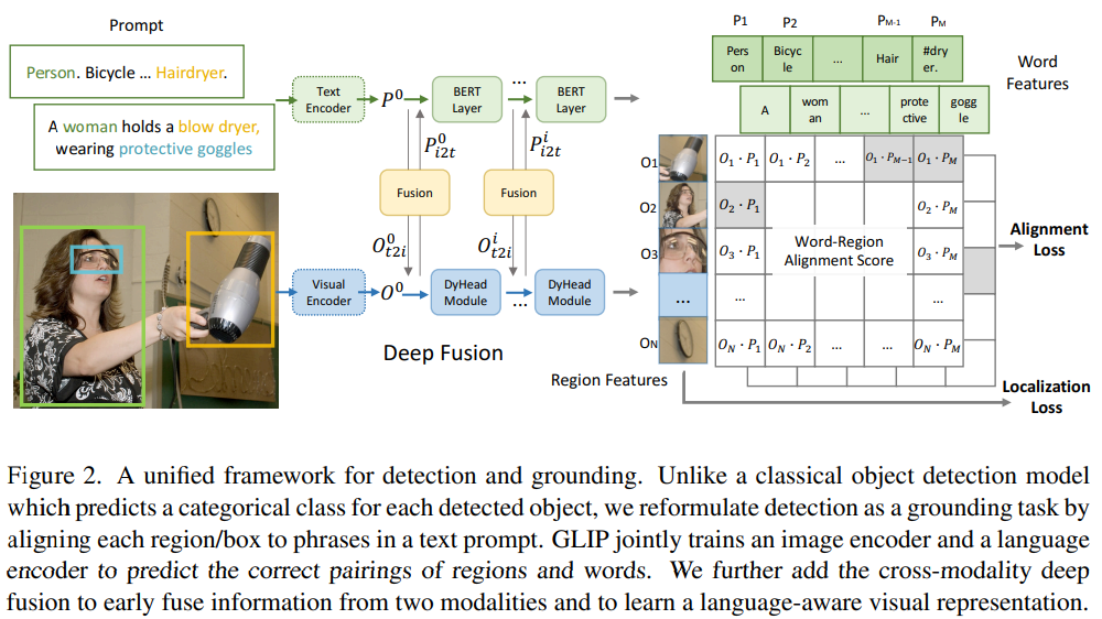 하지만 GLIP 모델에서는 late-fusion 방식을 사용하지 않고, phrase grounding 모델을 학습하기 위해 visual과 language feature들의 deep fusion 방식을 사용합니다. (저자들은 early-stage fusion이라고도 하네요.)