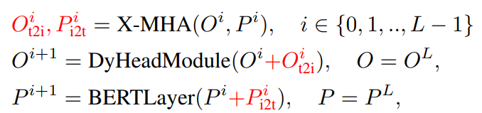 위 GLIP 모델의 그림 중간에서 보시는 것처럼 마지막 몇 개의 encoding layer에서 이미지와 텍스트 정보들을 융합(fusion)합니다. 본 논문은 이미지 encoder로 Dyhead를 사용하고 텍스트 encoder로 BERT를 사용합니다.