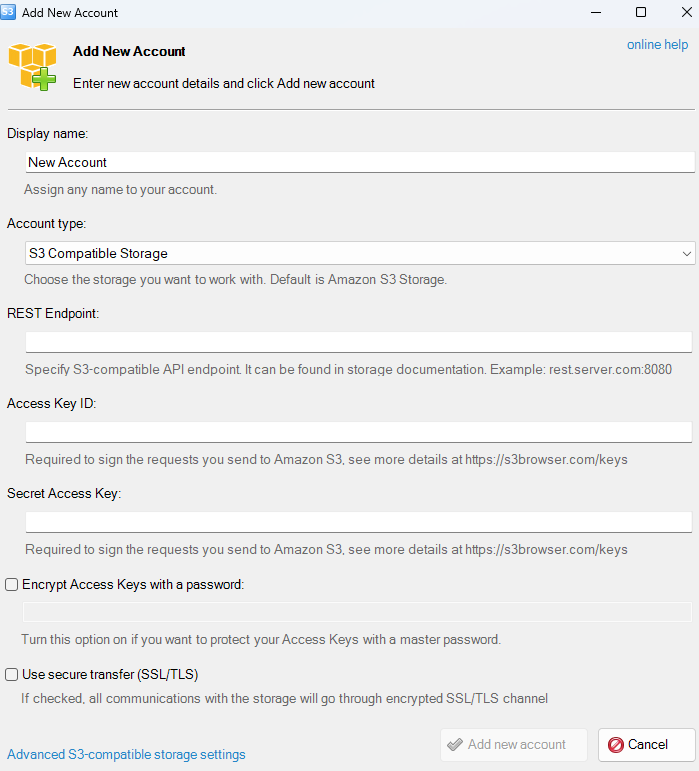 1. S3 Browser 설치 후 Add new account를 눌러 접속 정보를 추가하는 창을 엽니다.