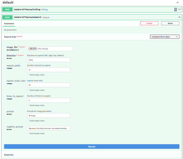 일단 두 API 중 위부터 보겠습니다. 화살표를 누르고 "Try it out" 버튼을 누르시고 나머지는 건드릴 필요 없이 text_prompt에 원하시는 프롬프트를 입력하시면 됩니다. 단, 꼭 영어로 하셔야 합니다!