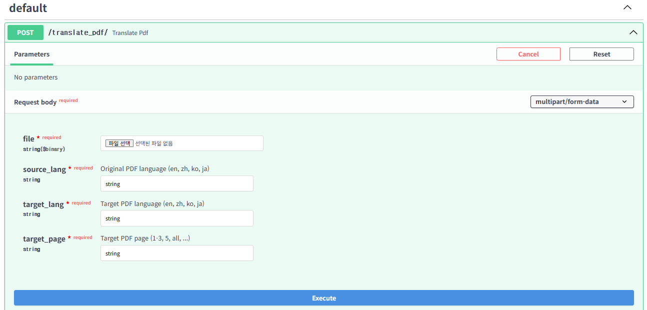우측의 화살표를 누르고 "Try it out" 버튼을 누르면 아래와 같은 화면이 나오는데 여기서 file에 pdf를 업로드 하시고 Execute를 누르면 됩니다.