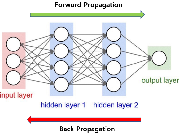 - 역방향으로 오차를 전파시키면서 각 층의 가중치를 업데이트하고 최적의 학습 결과를 찾아가는 방법