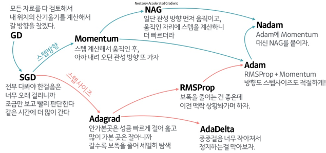 - 가중치를 업데이트하는 방법은 경사하강법에서 생기는 여러가지 단점을 극복하기 위해 다양한 알고리즘