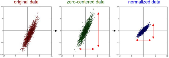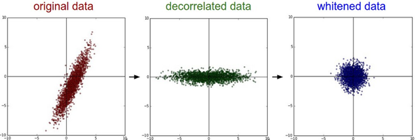 - 데이터의 평균을 0, 그리고 공분산을 단위행렬로 갖는 정규분포 형태로 변환