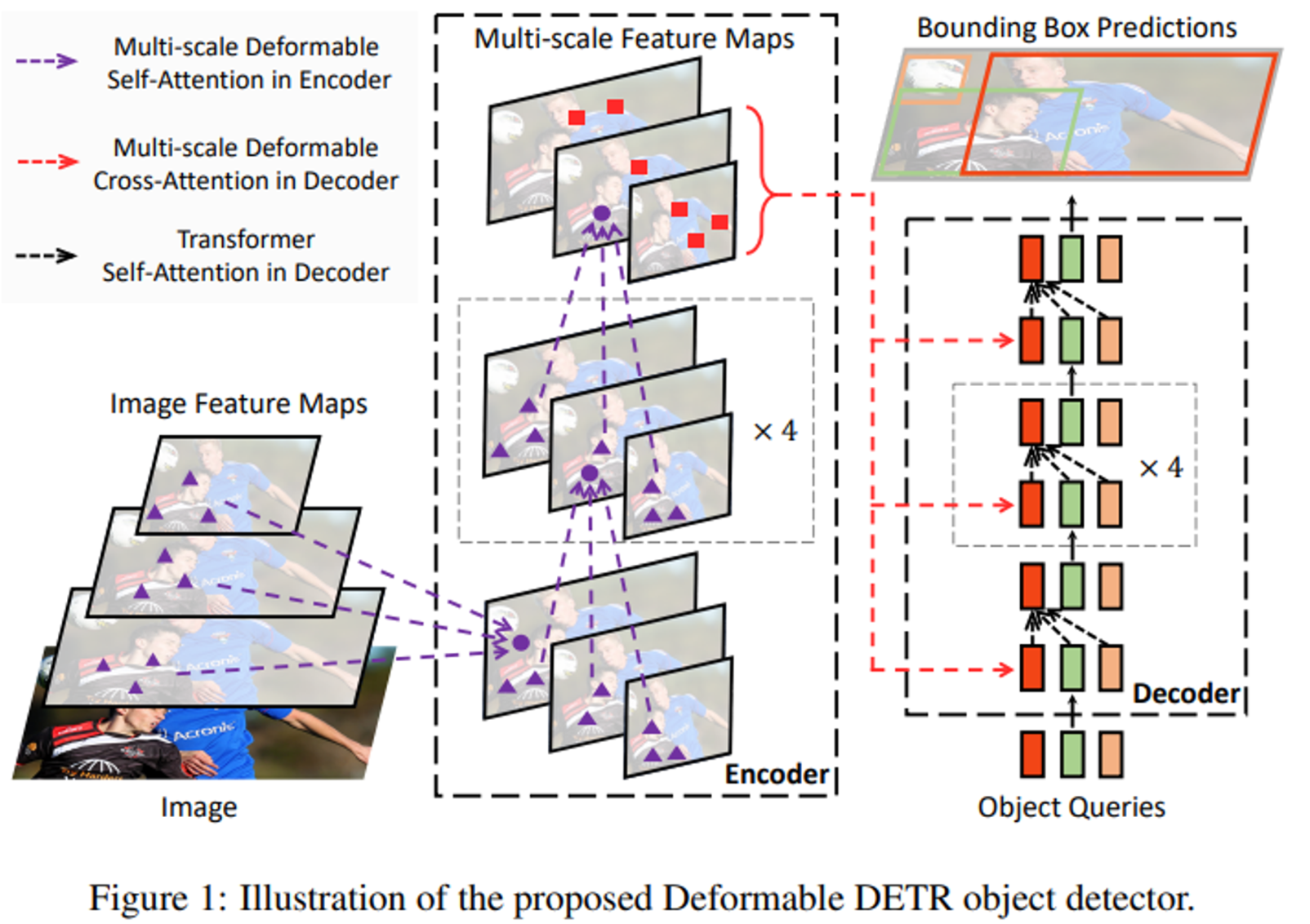 Figure 1에서 볼 수 있듯이, Encoder Part의 기존 Transformer attention 모듈을 Deformable attention module로 변경하였으며, Cross Attention Part에서도 Deformable attention module이 적용된다.