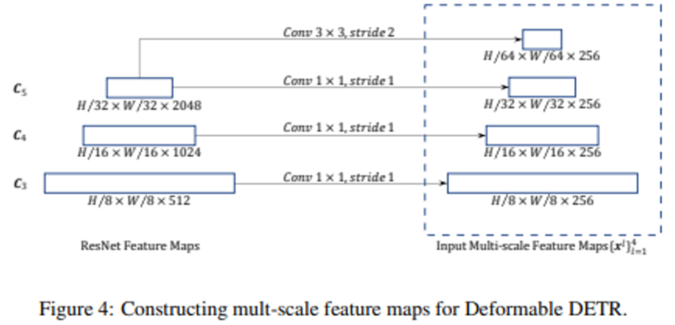 모든 Feature map의 C는 256으로 고정(1x1Conv 이용)하였으며, Multi Scale Deformable Attention 자체가 Feature Map 사이의 정보를 교환할 수 있으므로 FPN은 사용하지 않았다.