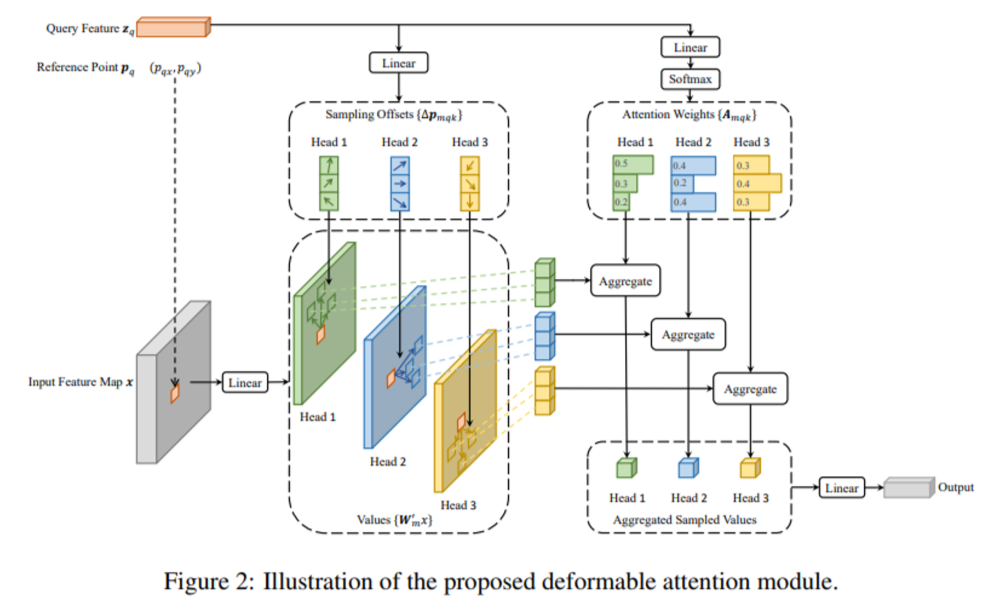 $\Delta p_{mqk}$ 와 $A_{mqk}$는 $m$번째 head와 $k$번째 sampling point에 해당하는 offset과 attention weight를 의미한다.